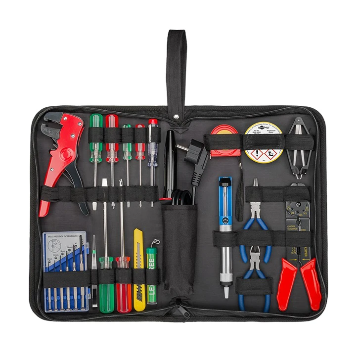 | - Kompaktna kutija za alat sa osnovnom opremom za lemljenje i DIY radove, praktična za upotrebu kod kuće i na putu, dimenzije 340 x 210 x 50mm |