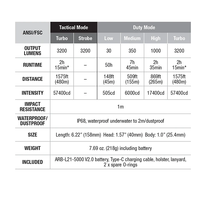 | - Turbo: 3200lm, Vreme rada: 2h 15min, Udaljenost: 480m, Jačina svetlosti: 57400cd |